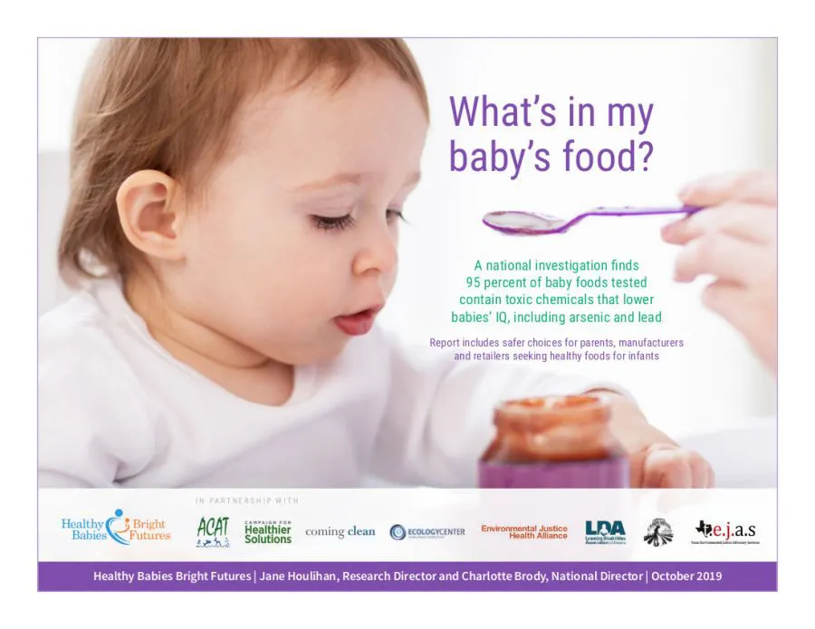 Kết quả kiểm tra của 168 sản phẩm đồ ăn dành cho trẻ nhỏ từ các nhà sản xuất lớn ở Mỹ đã phát hiện 95% trong số đó chứa chì, 73% chứa arsenic, 75% chứa cadmium và 32% chứa thủy ngân. 1 phần 4 trong số các sản phẩm này chứa cả 4 kim loại nặng vừa nêu.