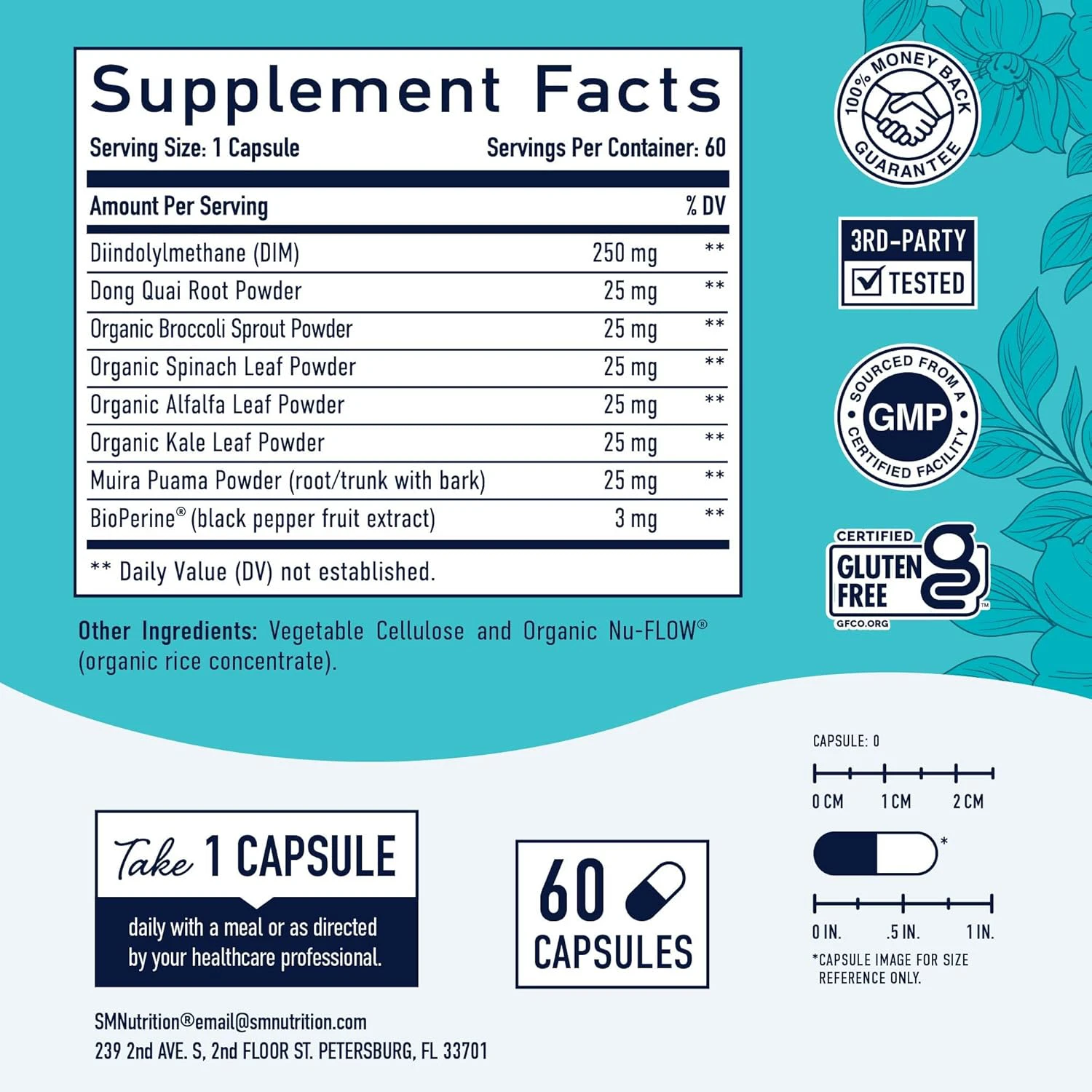 Mỗi viên DIM 200 chứa lượng DIM tương đương với 1kg rau họ cải. Ngoài ra, công thức của SMNutrition bao gồm BioPerine (chiết xuất hạt tiêu đen) để hỗ trợ hấp thụ tốt hơn.