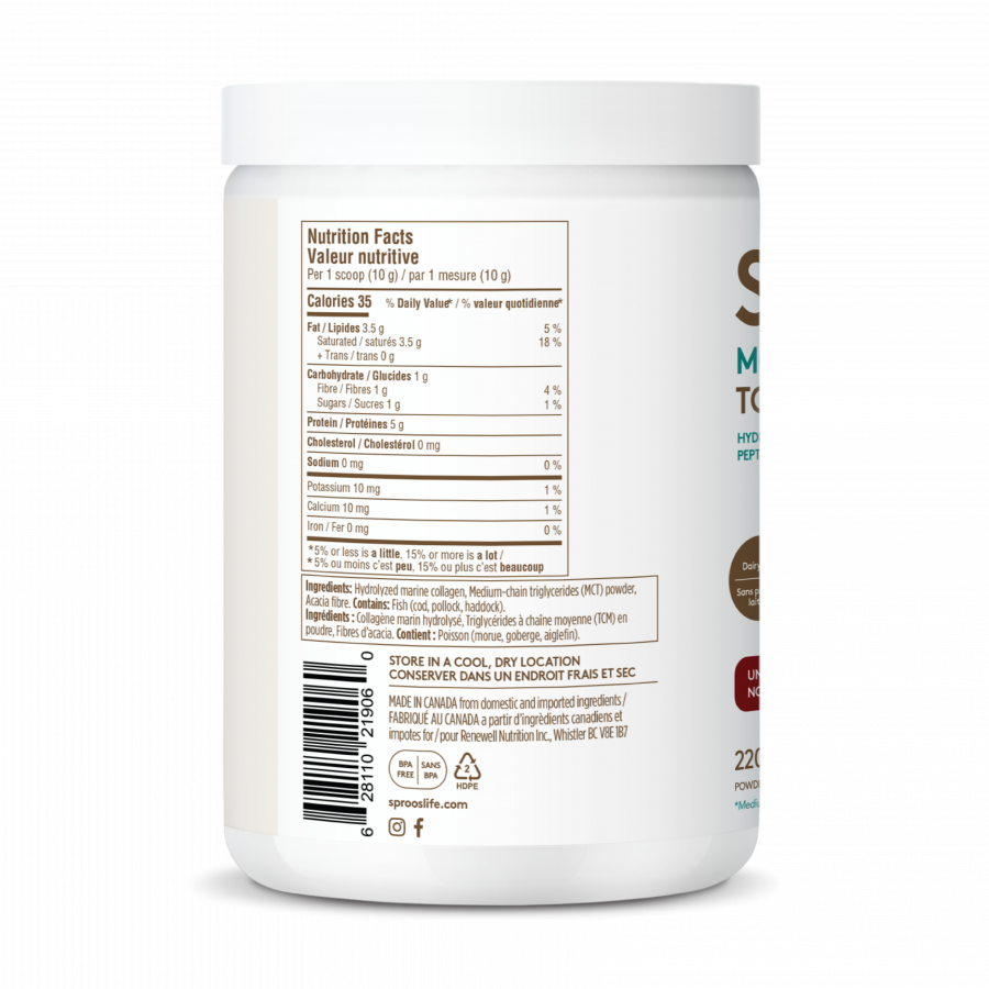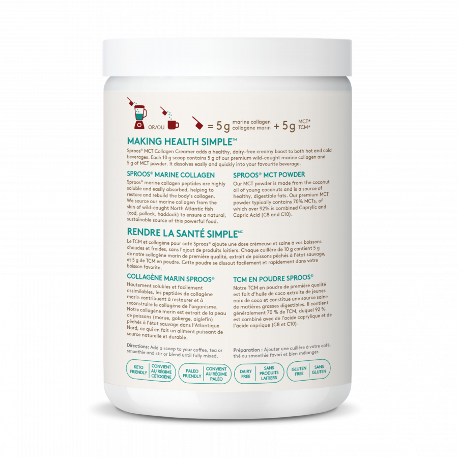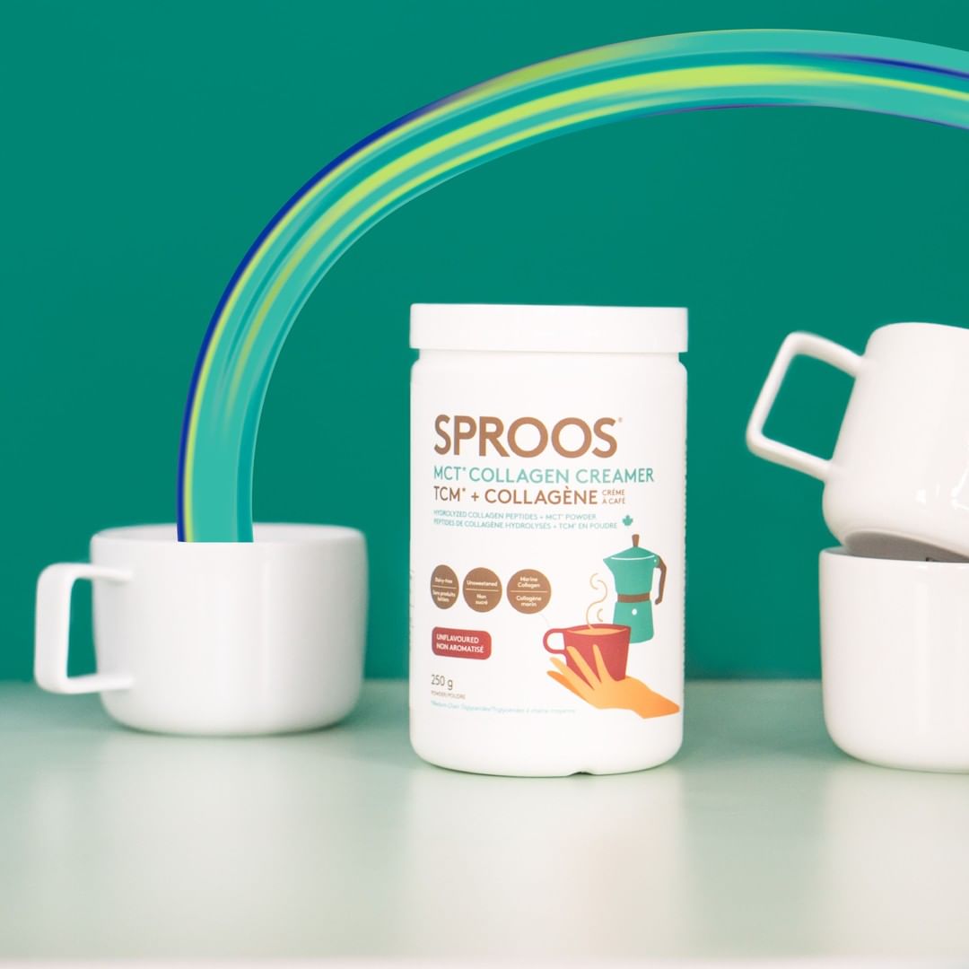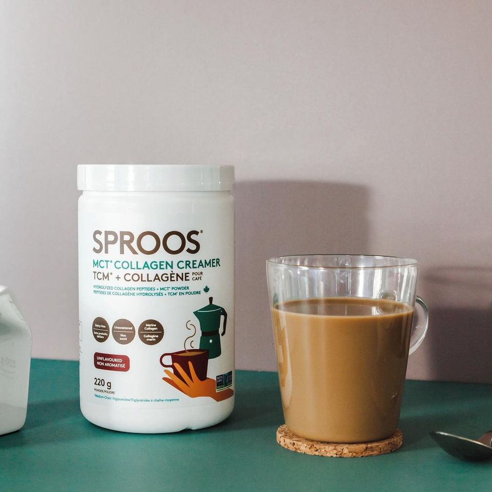 - Sproos® giúp cà phê, trà hoặc sinh tố của bạn creamy hơn bằng loại kem không chứa sữa, được làm bằng sự cân bằng của collagen thủy phân từ cá được đánh bắt tự nhiên cao cấp và bột MCT (Medium-Chain Triglycerides). Bột MCT được làm từ dầu dừa của trái dừa non và là nguồn cung cấp chất béo tiêu hóa lành mạnh để hỗ trợ sức khỏe não bộ tối ưu. Thêm loại kem thơm ngon này vào đồ uống của bạn với hương vị trung tính để không phải lo lắng về việc nó làm hỏng hương vị cà phê yêu thích của bạn.