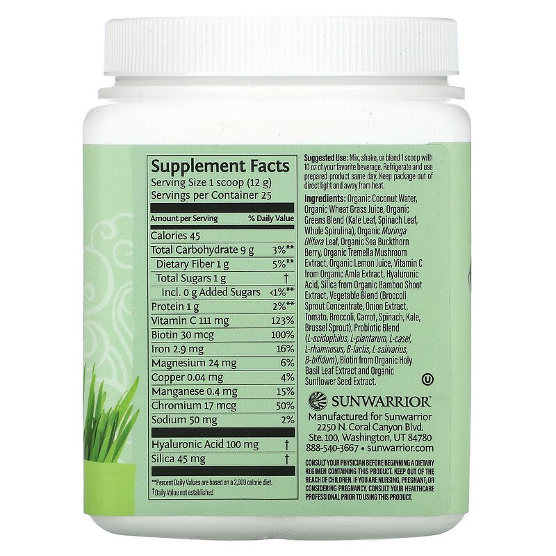Sự pha trộn độc đáo cung cấp tương đương 1 khẩu phần rau: mầm bông cải xanh, chiết xuất hành, cà chua, bông cải xanh, cà rốt, rau spinach, cải kale và cải Brussels.