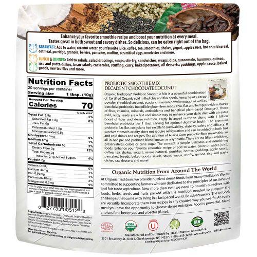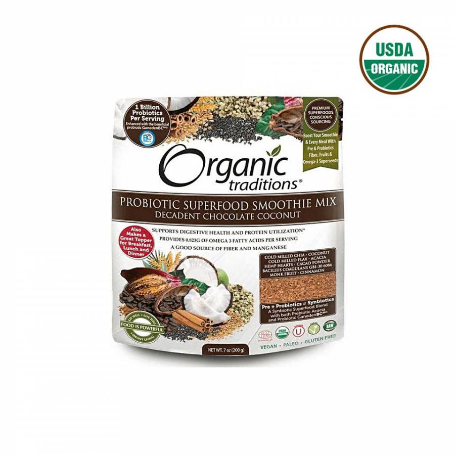 Organic Traditions Probiotic Superfood Smoothie Mix là một sự kết hợp tuyệt vời giữa hạt chia và hạt lanh hữu cơ, trái cây gai dầu, bột cacao, vụn dừa , acacia, bột quế, và các probiotic có lợi. Các hạt không chứa gluten như chia, lanh và cây gai dầu cung cấp một nguồn chất xơ, vitamin, khoáng chất, chất chống oxy hoá và Omega 3 thực vật có lợi.