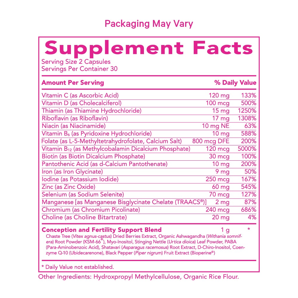 Công thức bao gồm tất cả các yếu tố cần thiết với các thành phần chính như Chaste Tree Berry (Vitex), Myo-Inositol, Folate, Vitamin B, Vitamin C, Vitamin D, Biotin và Kẽm, để hỗ trợ thụ thai và sức khỏe sinh sản.