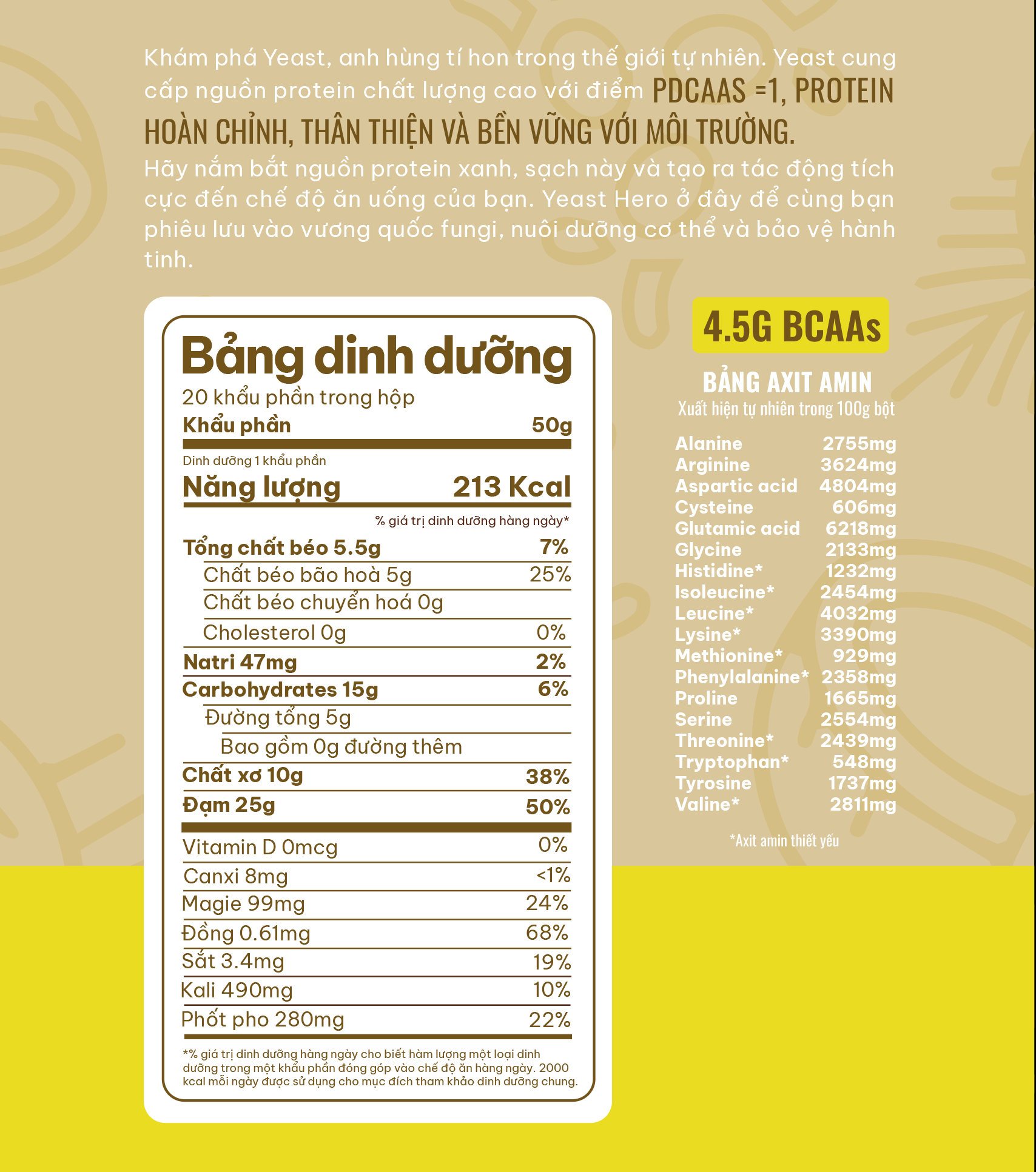 - 1 khẩu phần cung cấp 25g protein và 10g chất xơ, 4.5g BCAAs