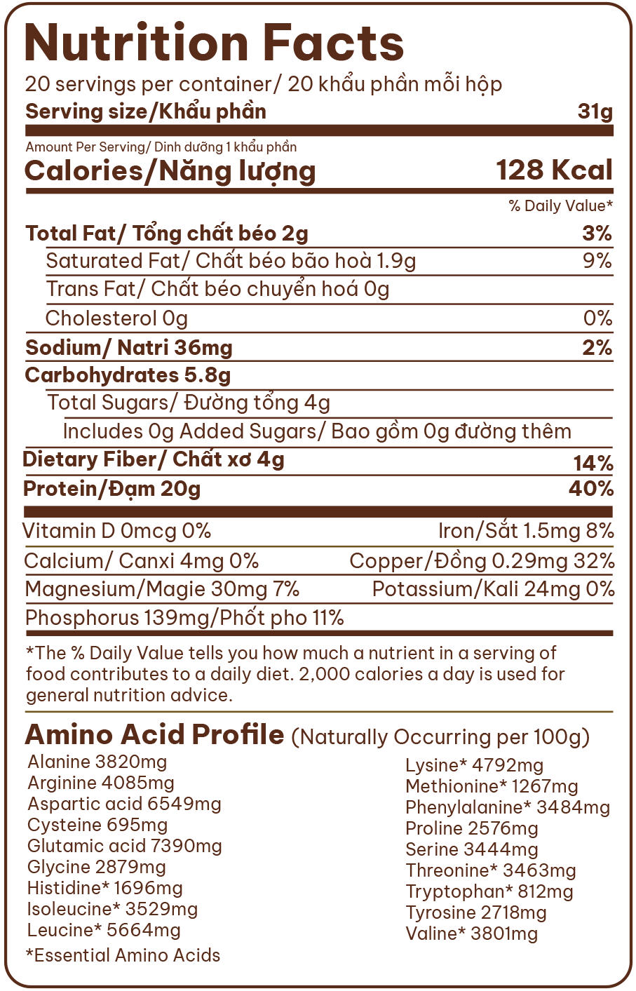 - 1 khẩu phần cung cấp 20g protein, 4g chất xơ, 4g BCAAs