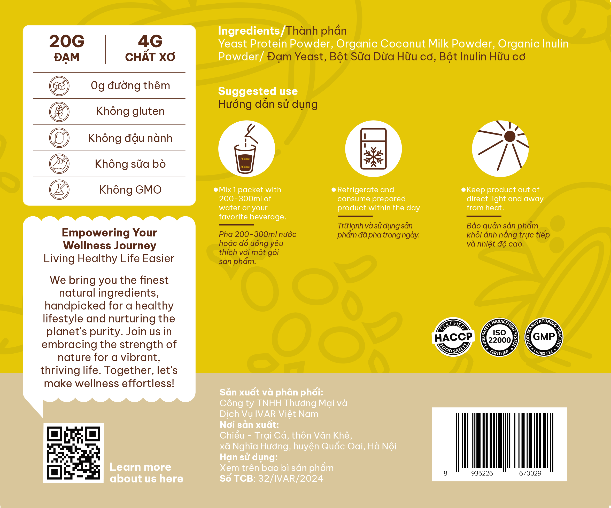 - Sản xuất trong cơ sở đạt chứng nhận ISO 22000, HACCP, GMP
