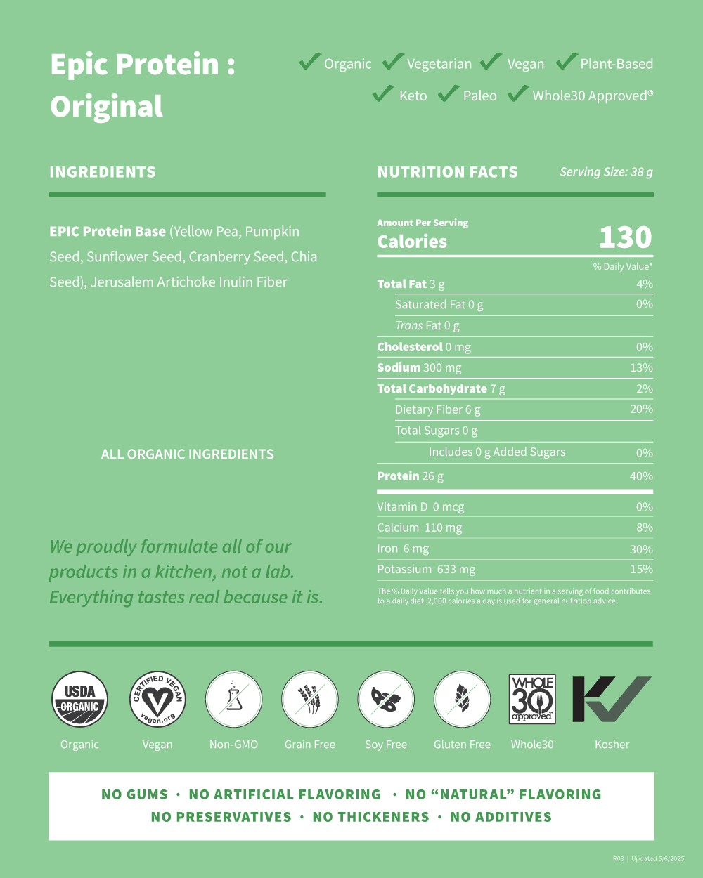 Protein thực vật Epic Protein Original được lựa chọn cẩn thận để có hàm lượng protein cân bằng, sinh khả dụng cao và đa dạng dinh dưỡng. Dễ dàng hòa tan trong nước. Bổ sung các chất dinh dưỡng như axit béo omega từ hạt sacha inchi và một loạt các chất chống oxy hóa từ hạt nam việt quất, cùng với vô số chất khác, tạo ra một loại nhiên liệu mạnh mẽ giúp cơ thể bạn tổng hợp protein một cách tối đa, nhanh chóng phục hồi sau khi làm việc vất vả hay tập thể dục và phát triển các mô cơ thể. Vị nguyên bản thơm ngon để bạn dễ dàng kết hợp với các loại trái cây và các loại rau yêu thích của bạn.
