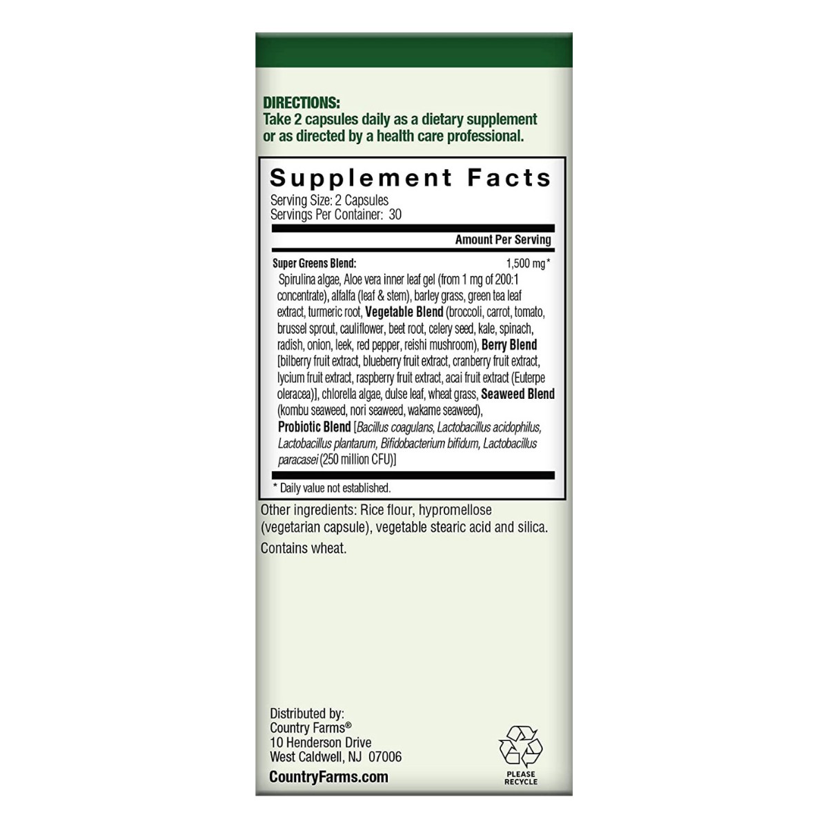 - Ngay cả những người quan tâm đến sức khỏe nhất cũng cảm thấy khó tiêu thụ đủ ‘siêu thực phẩm’ để có được những lợi ích sức khỏe tuyệt vời từ chúng. Rốt cuộc, bạn có thể tìm thấy cỏ lúa mì, cỏ linh lăng, rong biển kombu, dâu rừng và các siêu thực phẩm khác ở một nơi thuận tiện đến mức nào? Và làm thế nào để bạn xác định lượng dùng bao nhiêu để tận hưởng những lợi ích lành mạnh Hãy quên phỏng đoán và thử Country Farms Super Greens Capsules, cách thuận tiện nhất để có được rau xanh.