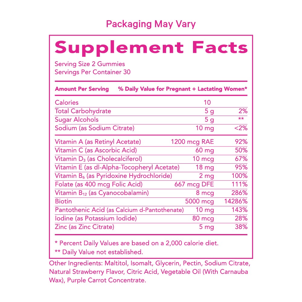 Chứa tất cả các chất dinh dưỡng cần thiết bao gồm các thành phần chính như biotin, folate, vitamin B6, vitamin B12 và axit pantothenic để ngăn chặn sự rụng róc sau sinh và hỗ trợ sự phát triển của tóc mới chắc khỏe đồng thời cung cấp các chất dinh dưỡng giúp phục hồi cơ thể sau khi sinh