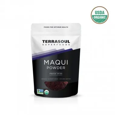 Quả mọng Maqui (MAH-kee) mọc ở vùng Patagonia, miền nam Chile, nơi chúng được thu hoạch thủ công, đông khô trong vòng vài giờ sau khi hái và xay nhẹ thành bột dễ sử dụng. Terrasoul sản xuất một loại bột cao cấp đã loại bỏ hạt.